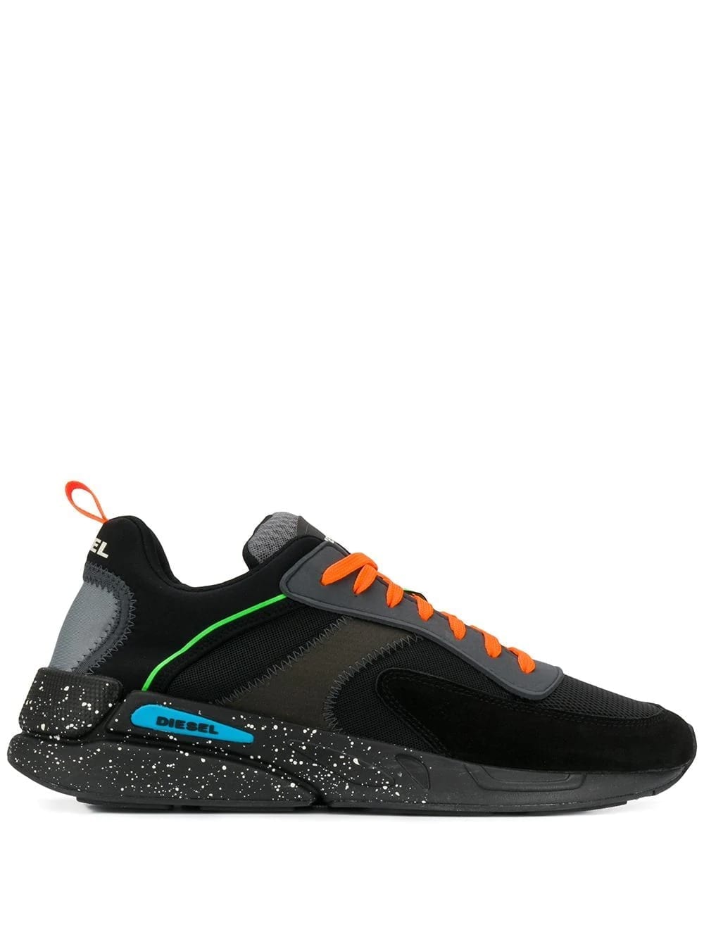 Multi-coloured low-top sneakers from Diesel featuring a round toe, mesh panels, a lace-up front fastening, a logo patch at the tongue, a paint splatter effect and a pull tab at the rear.