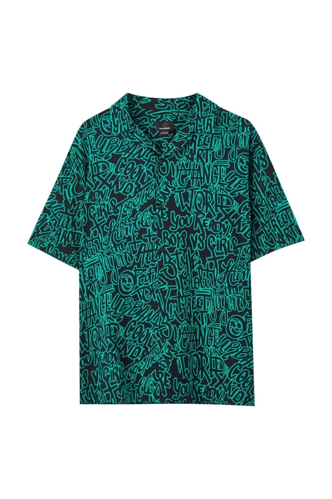Black viscose shirt with a green graffiti print, short sleeves, a classic collar and a button-up front.